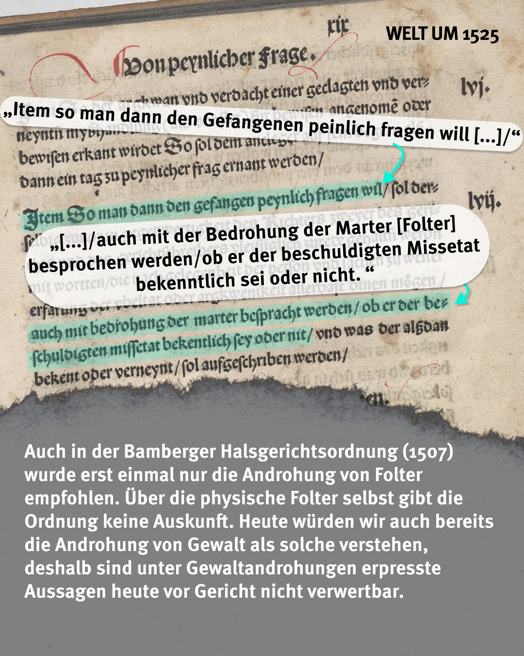 Die peinliche Befragung war eine Form der Folter in der Strafverfolgung um 1500. Heute ist die Folter durch verschiedene Verträge in den meisten Ländern der Welt verboten: bspw. durch die Allgemeinen Erklärung der Menschenrechte der Vereinten Nationen, die Europäischen Menschenrechtskonvention und die Charta der Grundrechte der Europäischen Union. In Deutschland verboten wurde die Folter erstmals 1740 in Preußen. Im Bauernkrieg wurde Tilman #Riemenschneider Opfer der peinlichen Befragung.