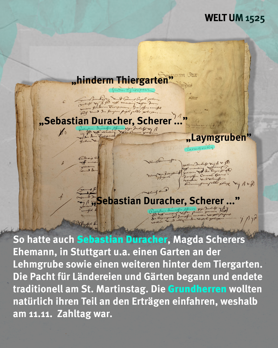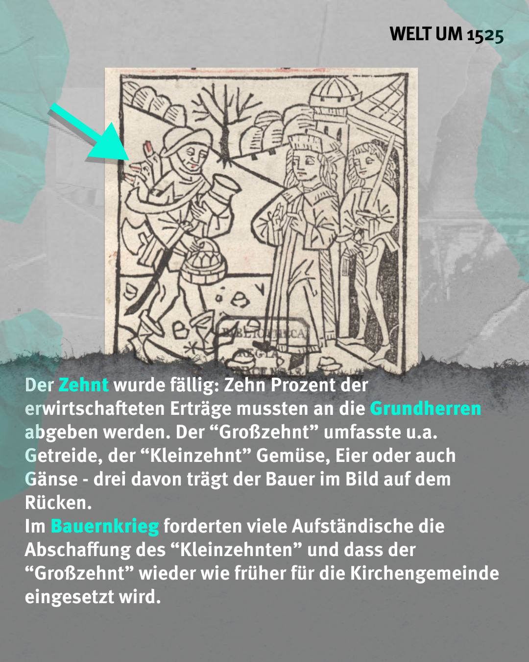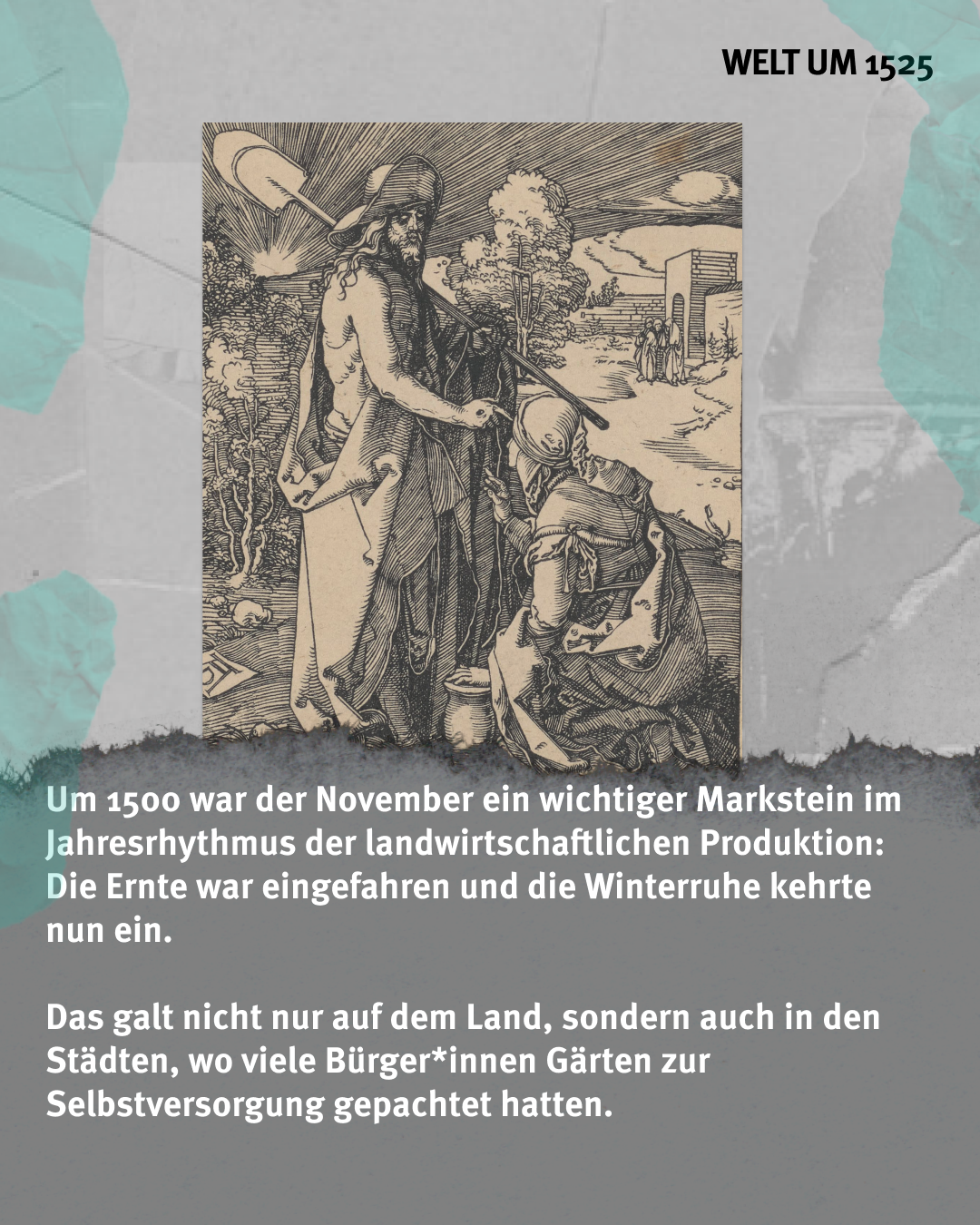 😇 Wer gärtnert denn da im zweiten Slide? Jap, Jesus ist da samt Schaufel auf dem Feld unterwegs und scheint dem Bauern Anweisungen zu geben, um eine möglichst gute Ernte 🥕einzufahren. Einen Teil davon mussten die Bauern im 16. Jh. allerdings an die Obrigkeit 👑 abgeben, etwa den Zehnt. Dafür gab es ausgewählte Tage im Jahr, bspw. St. Martin.