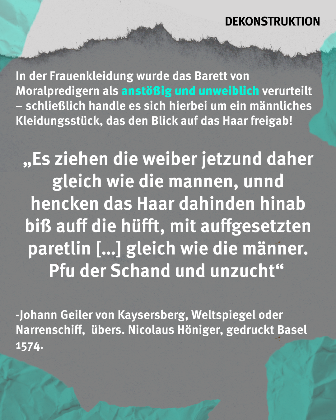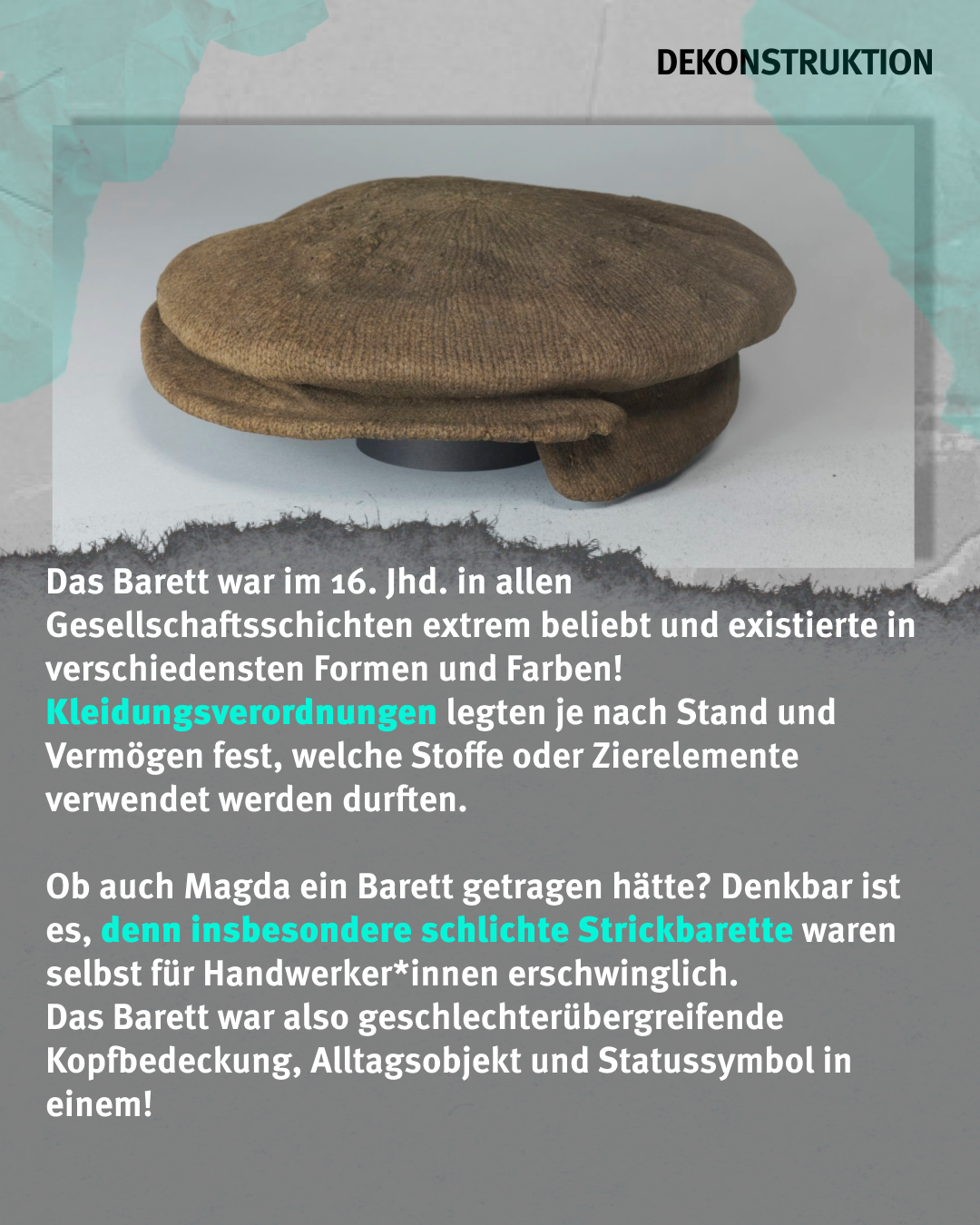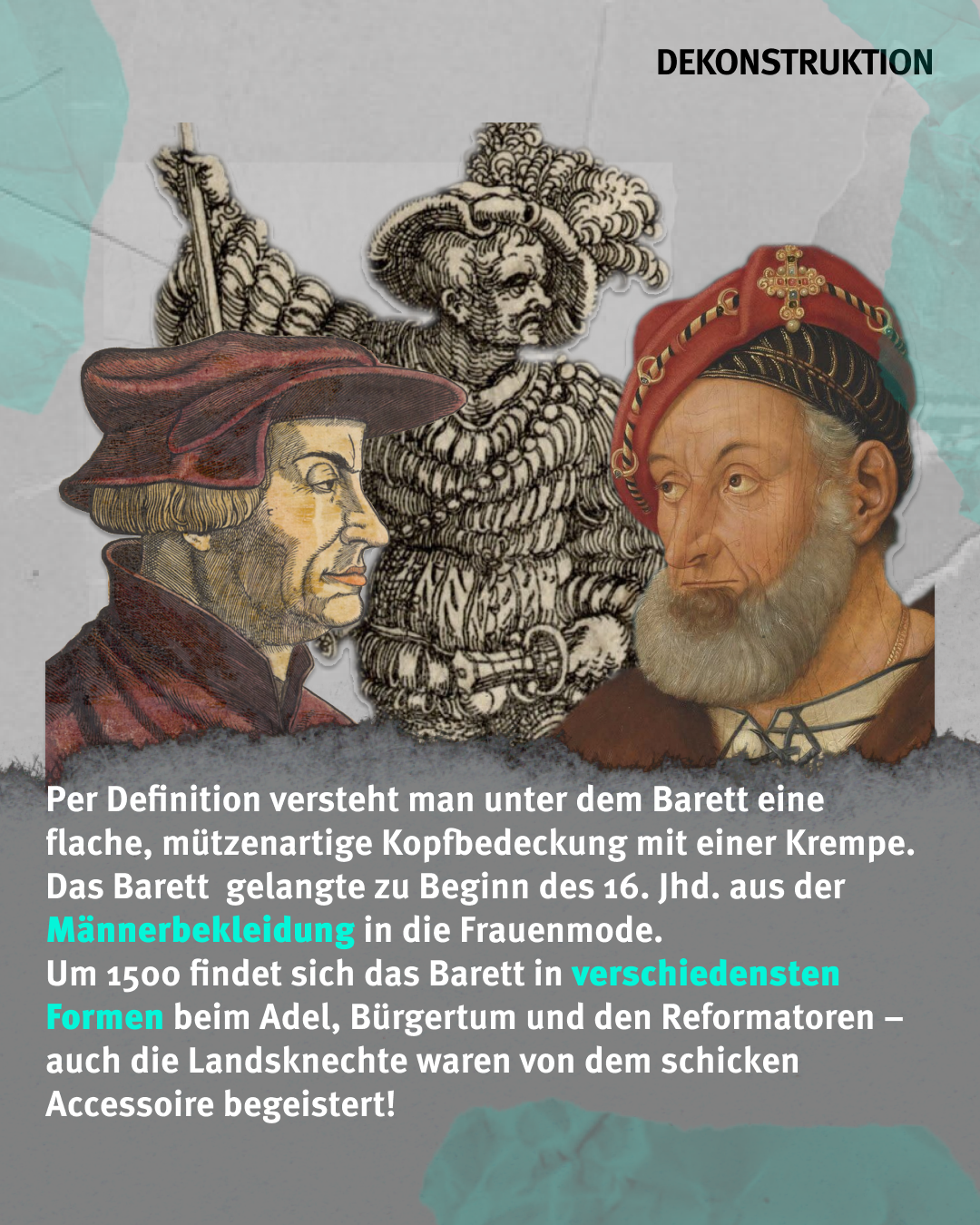 Im Mittelalter und der Frühen Neuzeit regelten Kleiderordnungen, wer welche Stoffe, Accessoires usw. tragen durfte - je nach Stand (und teils auch Wohlstand) der Person. Barette, vor allem gestrickte für den Alltag, waren in allen Ständen sehr beliebt und verbreitet. Bis ins späte 16. Jhd. war es die populärste Kopfbedeckung der städtischen Bevölkerung. Bäuer*innen allerdings wurde 1530 das Tragen des Baretts verboten. Im Laufe des 16. Jhds. änderte sich die Form der Kopfbedeckung - mal wurde sie größer und breiter, mal schmaler und kleiner. Egal in welcher Form, das #Barett blieb ein beliebtes #Accessoire!