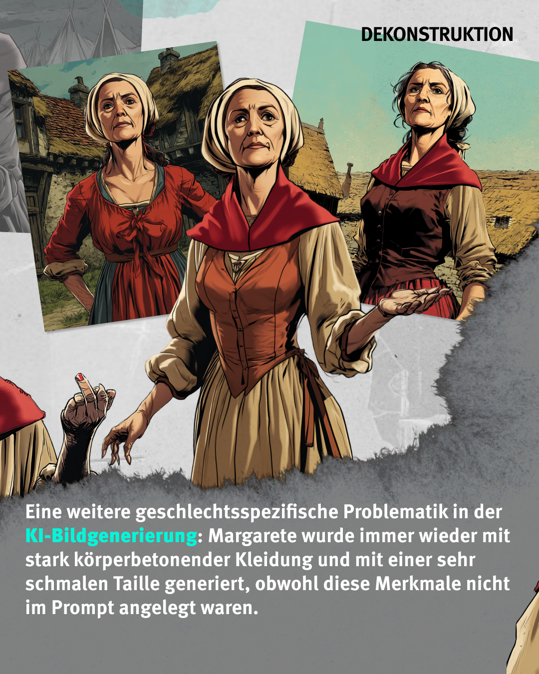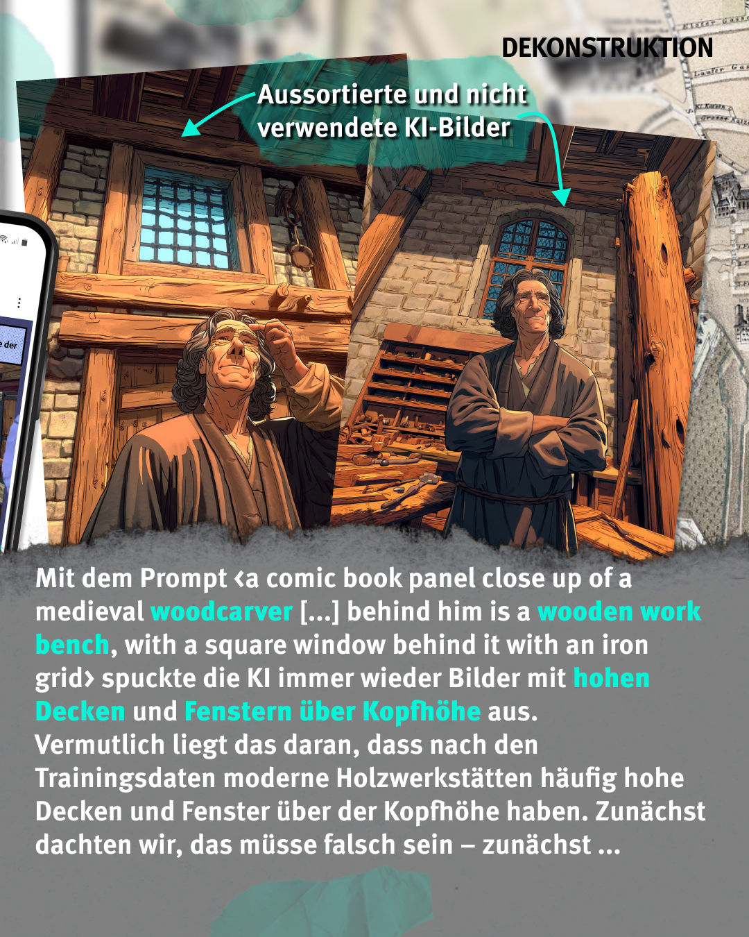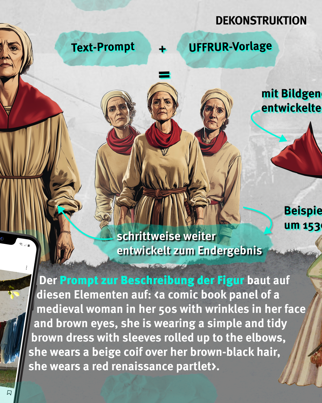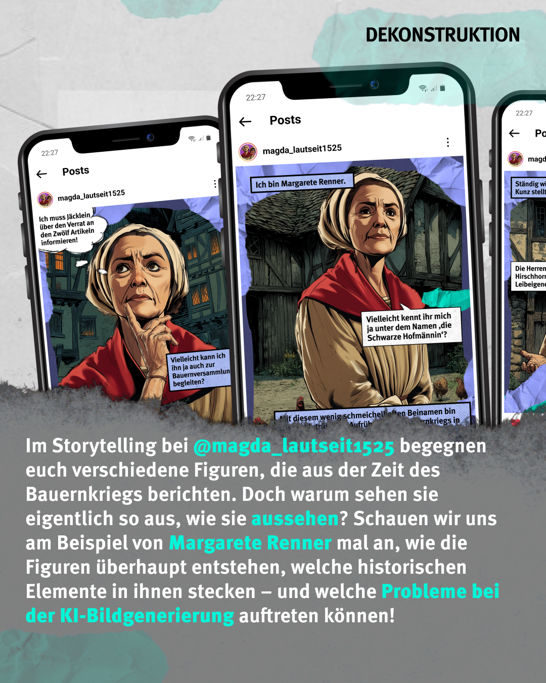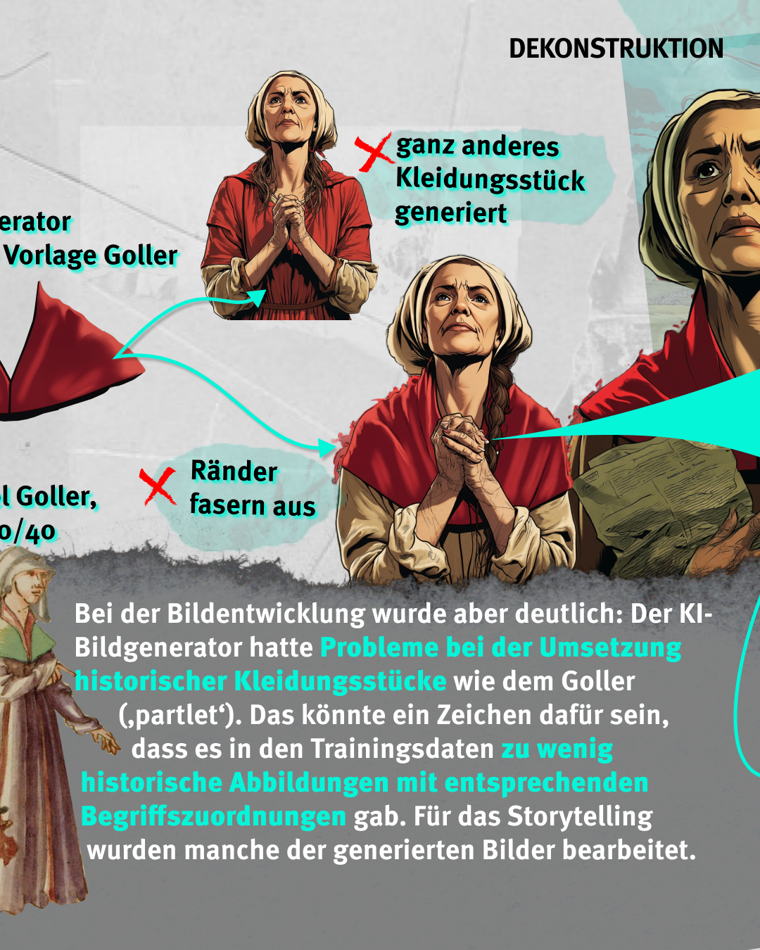 Wir schauen uns KI-generierte Darstellungen genau an: Was stimmt, was stimmt nicht? Auch die historischen Darstellungen selbst nehmen wir hier genau in den Blick – ebenso wie die Inhalte des Storytellings, die wir in einer Spurensuche kritisch hinterfragen.