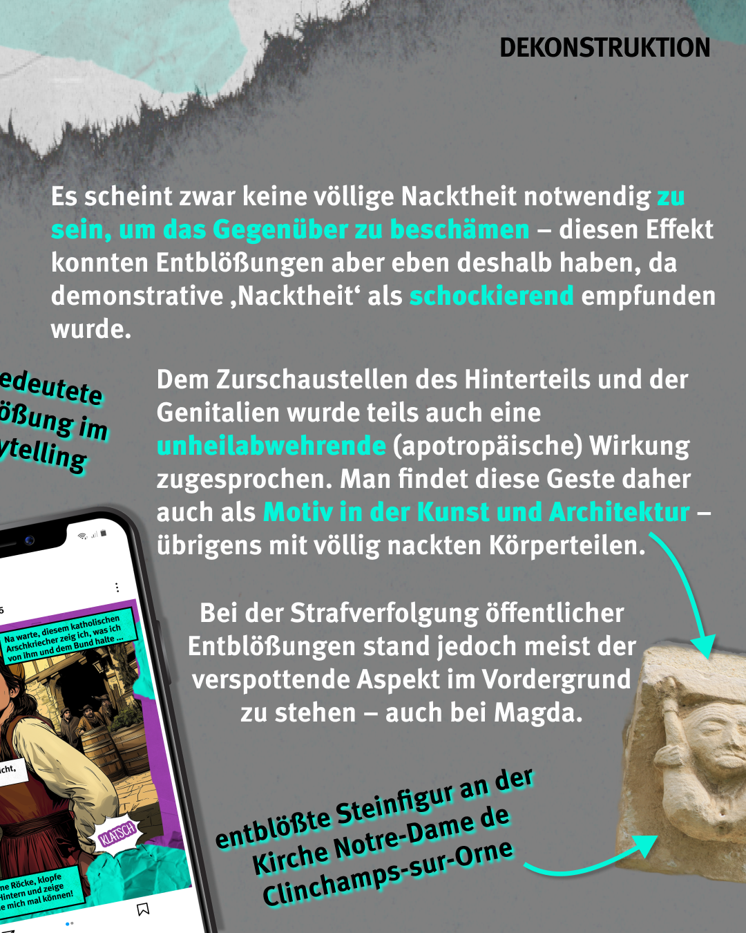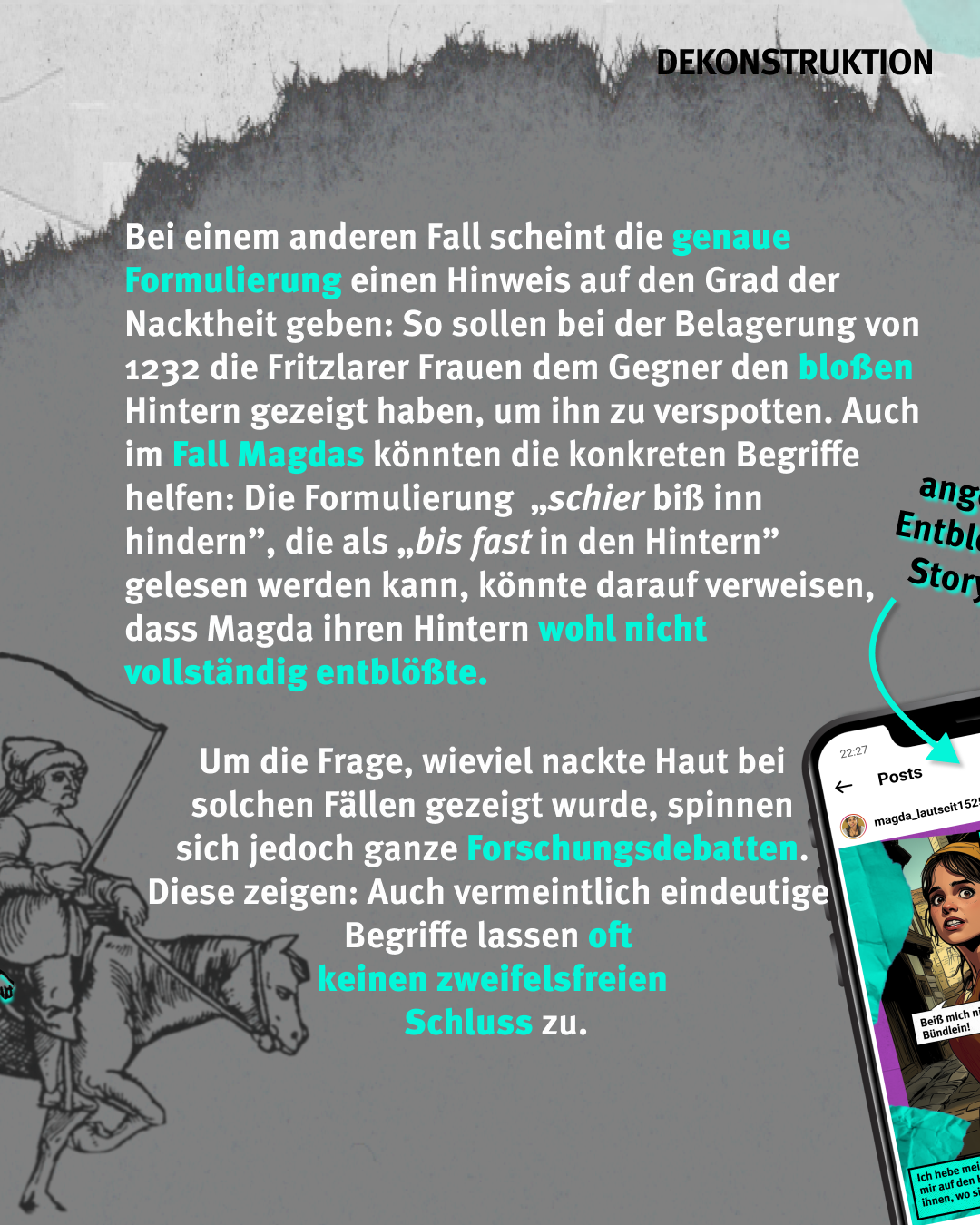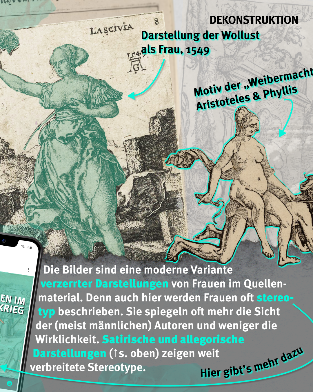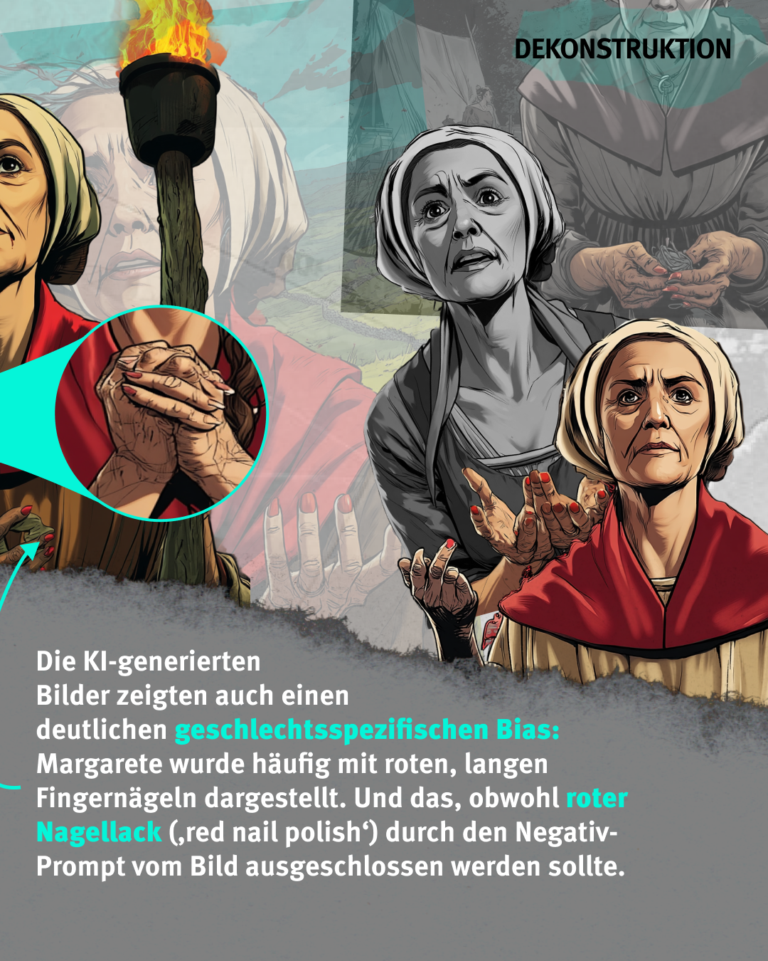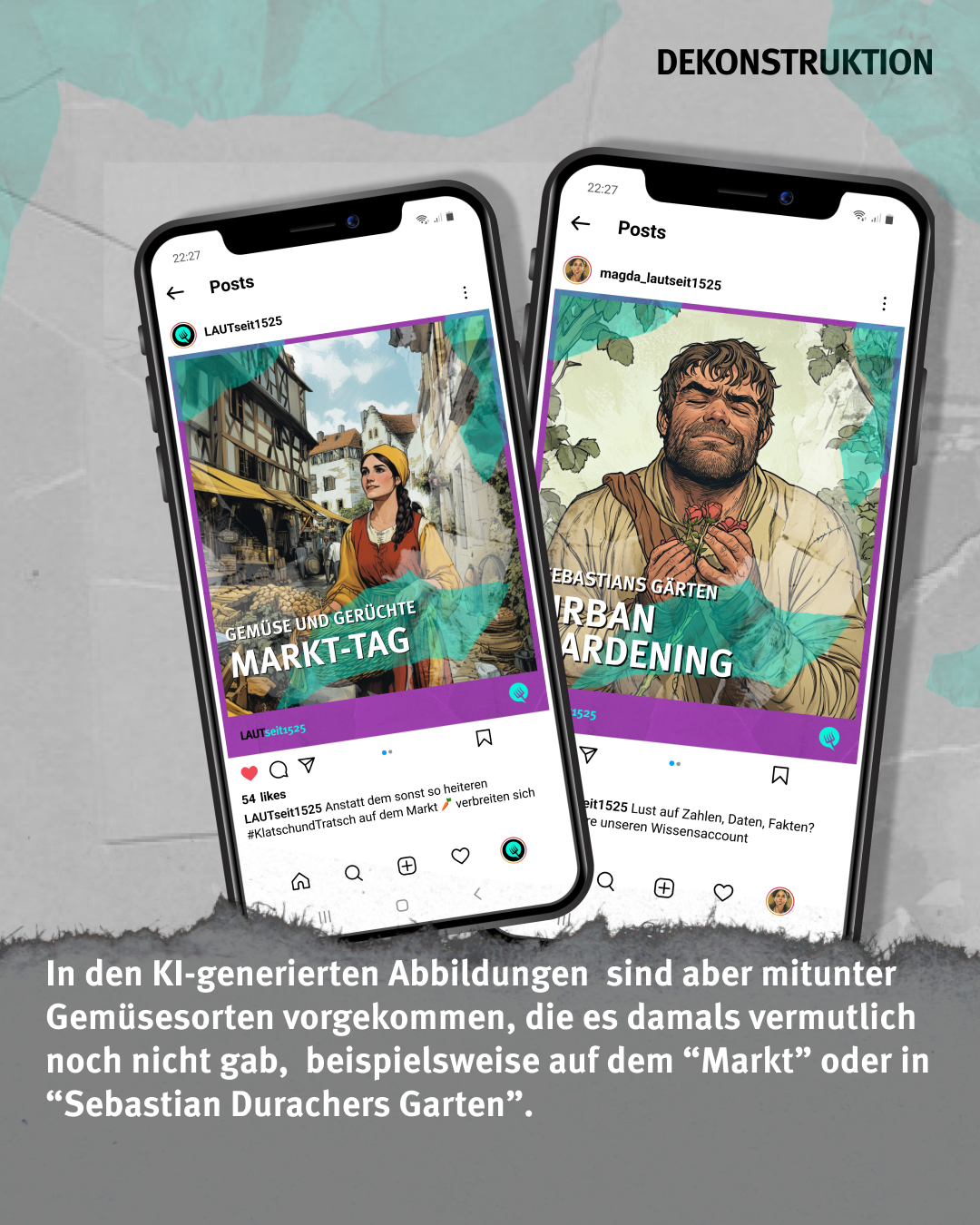 Wir schauen uns KI-generierte Darstellungen genau an: Was stimmt, was stimmt nicht? Auch die historischen Darstellungen selbst nehmen wir hier genau in den Blick – ebenso wie die Inhalte des Storytellings, die wir in einer Spurensuche kritisch hinterfragen.