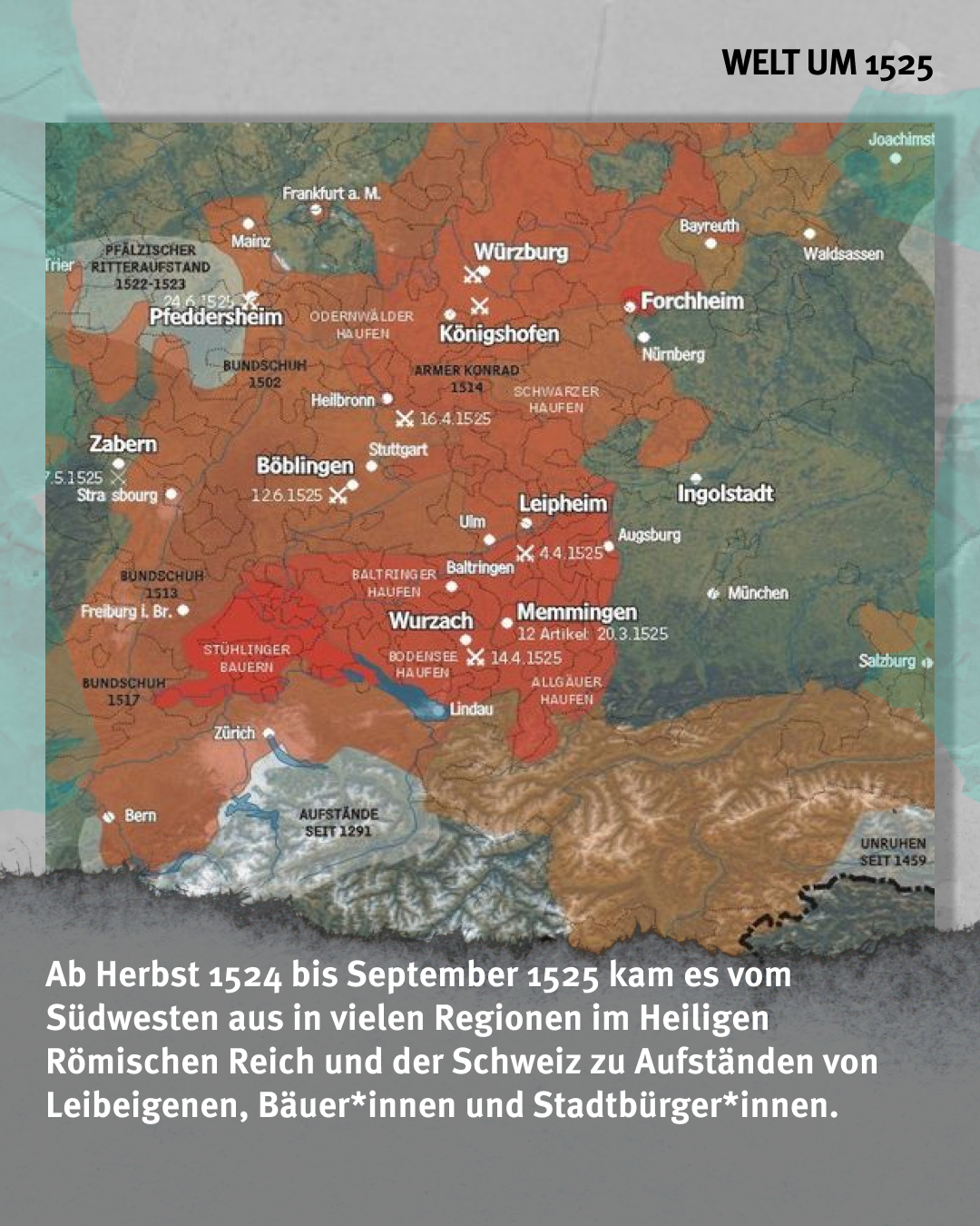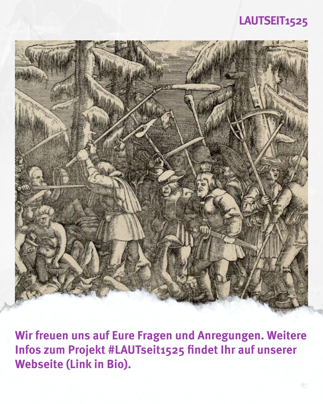 🌾 Die Bezeichnung ist ein wenig irreführend, da nicht nur ausschließlich Bäuer*innen damals nach #Freiheit und #Gerechtigkeit strebten. Der Ruf nach politschen Veränderungen von denen, die von der Herrschaft ausgeschlossenen waren - dem sog. Gemeinen Mann, hallte durch das #HeiligeRömischeReich. Der Bauernkrieg forderte ca. 70.000 bis 100.000 Todesopfer. In der Forschung wurde immer wieder diskutiert, ob es sich beim Bauernkrieg um ein in sich geschlossenes oder um mehrere gleichzeitige, aber eigenständige Ereignisse handele. Ihr könnt Euch im Laufe von #LAUTseit1525 ein eigenes Bild machen! Unstrittig ist, dass der Südwesten Deutschlands das Epizentrum dieser Bewegungen war.