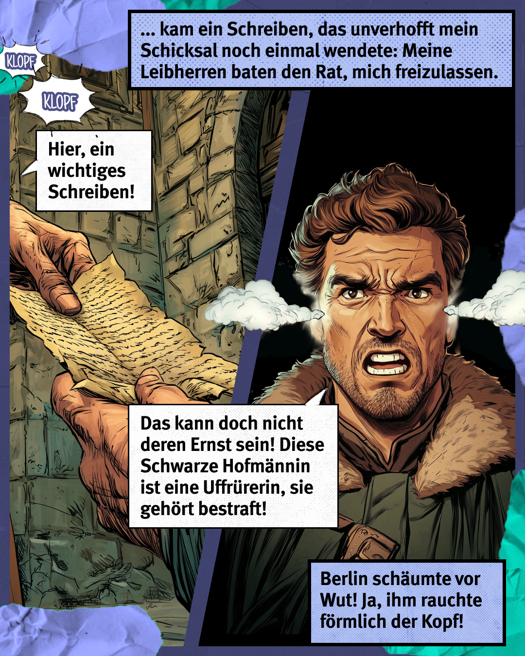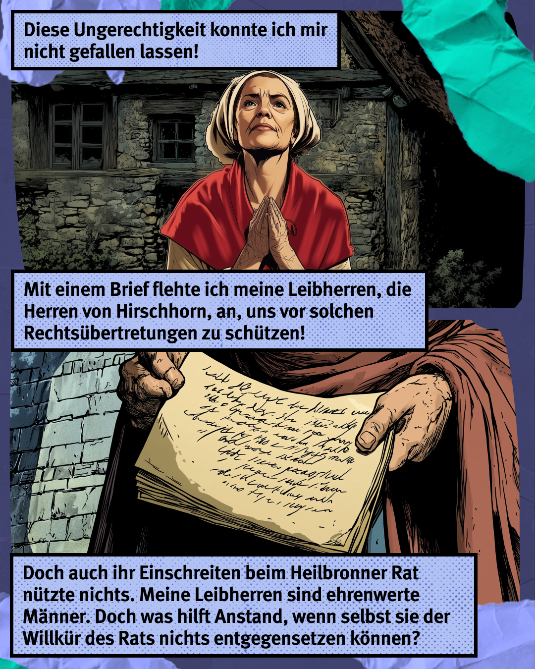 Sie gehört allerdings nicht zu den Neun, die auf dem Marktplatz der Stadt hingerichtet werden. Stattdessen wird sie wahrscheinlich im August 1525 aus der Haft entlassen: Und zwar auf Bitten ihres Leibherrn, der sich für sie beim Heilbronner Rat eingesetzt hatte.📜🙏